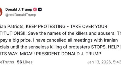 Мир США1 минута на чтение 13/01/2026 «Помощь уже в пути»: Трамп ультимативно поддержал протесты в Иране и отменил переговоры Президент США Дональд Трамп выступил с беспрецедентно резким заявлением в адрес руководства Ирана на фоне продолжающихся в стране кровавых…