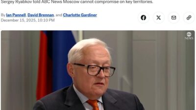 Россия США1 минута на чтение 16/12/2025 Россия заявила о готовности к миру, но без уступок по территориям и НАТО Заместитель министра иностранных дел России Сергей Рябков в интервью ABC News сделал заявление о возможности мирного урегулирования. По его…