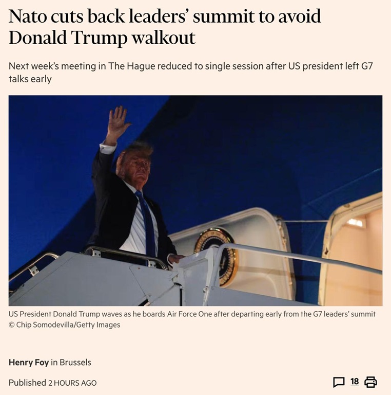 Из-за преждевременного ухода Трампа формат саммита НАТО следующей недели был изменён — количество рабочих сессий сократили до одной, чтобы избежать возможного повторного досрочного ухода американского лидера. Саммит пройдёт в Гааге, встречи лидеров запланированы на среду, а Зеленский примет участие в ужине во вторник вечером, сообщает RT.