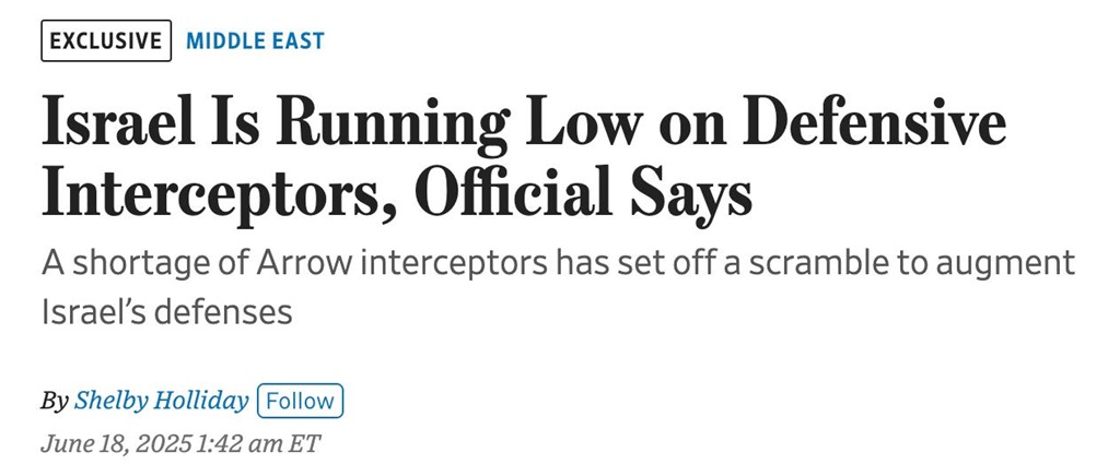 По данным The Wall Street Journal со ссылкой на американского чиновника, у Израиля исчерпываются запасы ракет-перехватчиков к системе противоракетной обороны Arrow. Это вызывает серьёзную обеспокоенность по поводу способности страны эффективно отражать баллистические ракеты большой дальности, поступающие из Ирана.